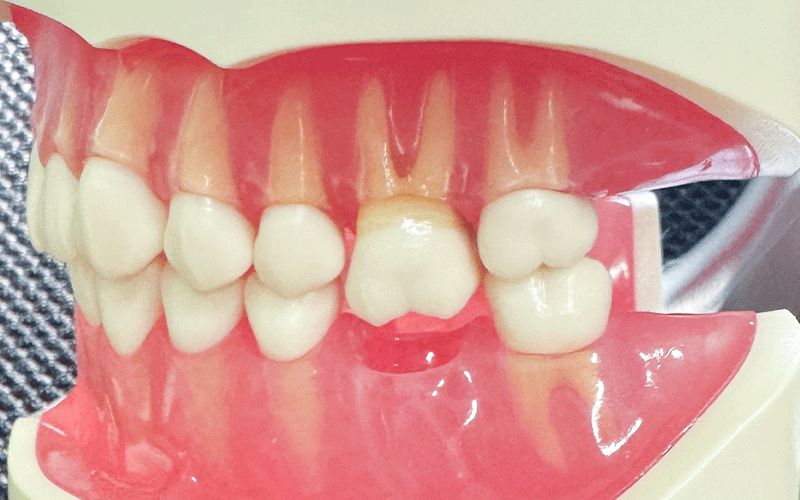 ▼右から2番目の下の歯がなくなって、上の歯が下に伸びてきた状態です(模型)。▼