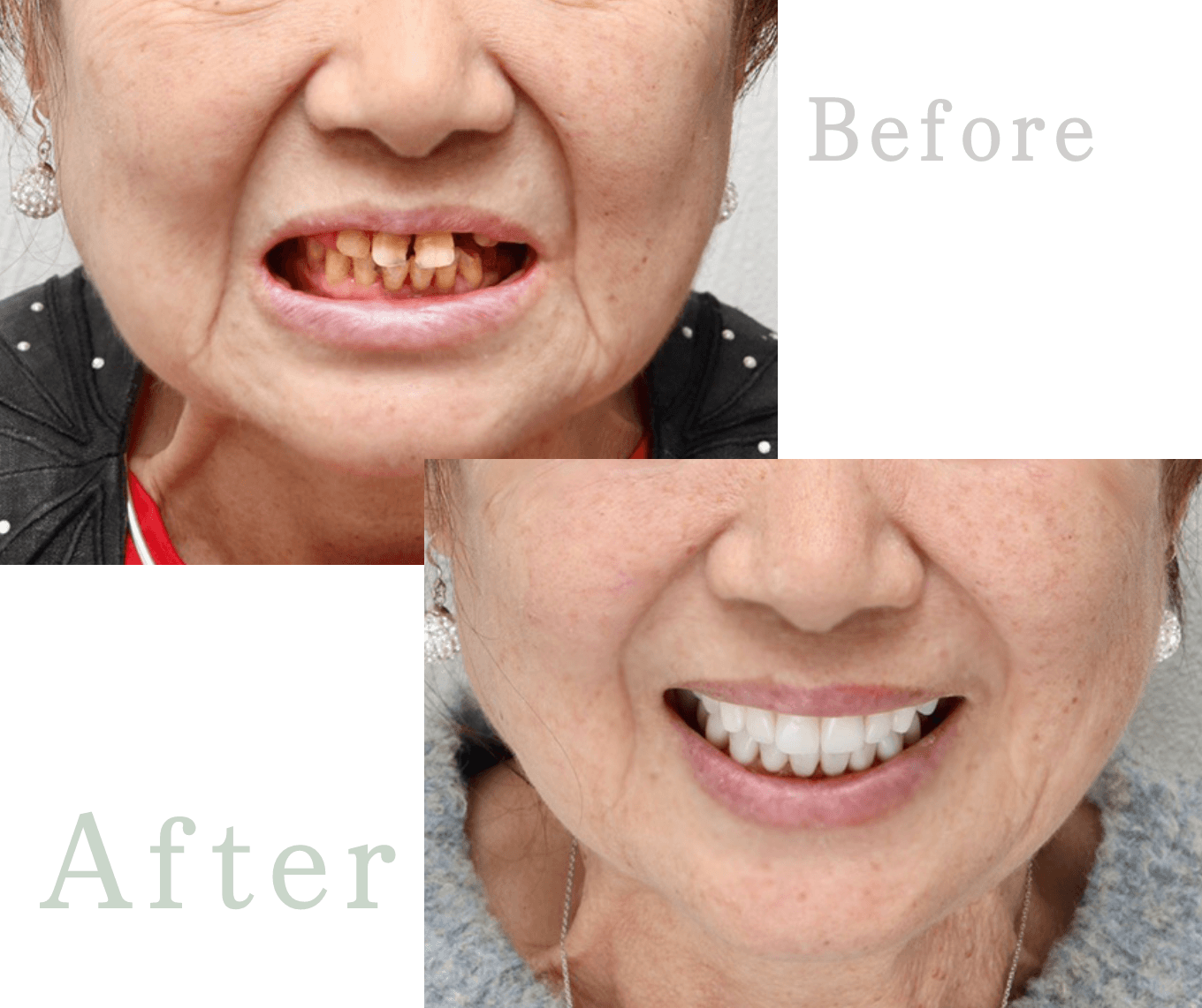 - 上顎は、総入れ歯を噛み合わせのバランスを考えながら、唇と調和するように作りました。 下顎は、なるべく歯を削らない方法でセラミックで修復しました。
